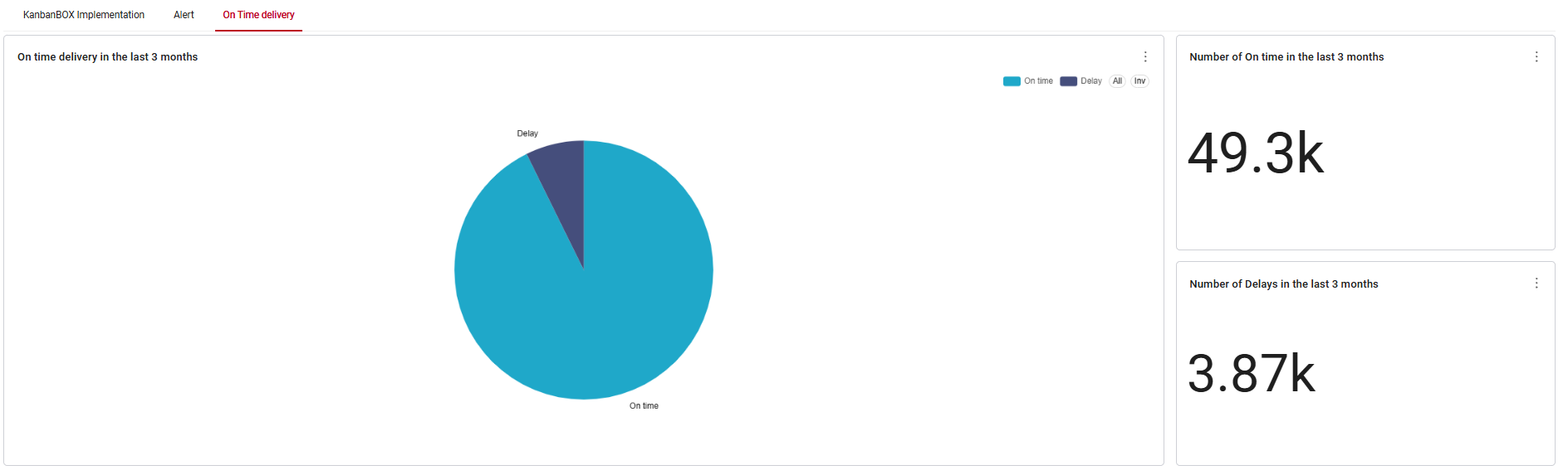 - On time delivery in the last 3 months: number of cards delivered on time or with delay. In KanbanBOX, "delivery" means declaring a card as "Full". A declaration of "Full" is on time when it occurs by the replenishment date or the confirmed date, depending on whether it is filled in or not.