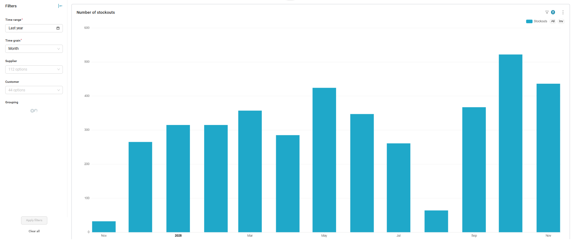- Number of stockouts: indicates the number of stockouts that occurred during the defined period of time. The data is aggregated based on the "time grain" filter, which allows viewing the delivered value for each month, week, or day.