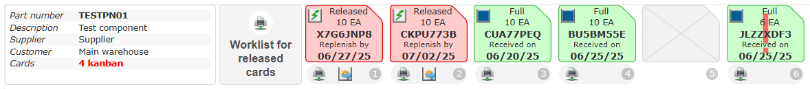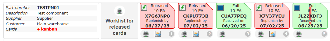 - If the total remaining quantity is not sufficient to guarantee standard coverage (e.g., consuming a 10-piece card reduces the total quantity to 34 pieces instead of 40), KanbanBOX automatically creates a new Kanban card in Released status with the standard quantity of 10 pieces, restoring the standard loop sizing.