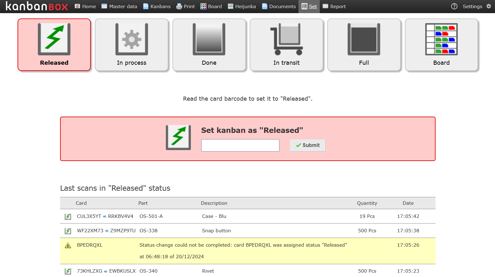 A status characterizes each electronic kanban card: this identifies the stage reached by the kanban container with the card. There are 9 different statuses: