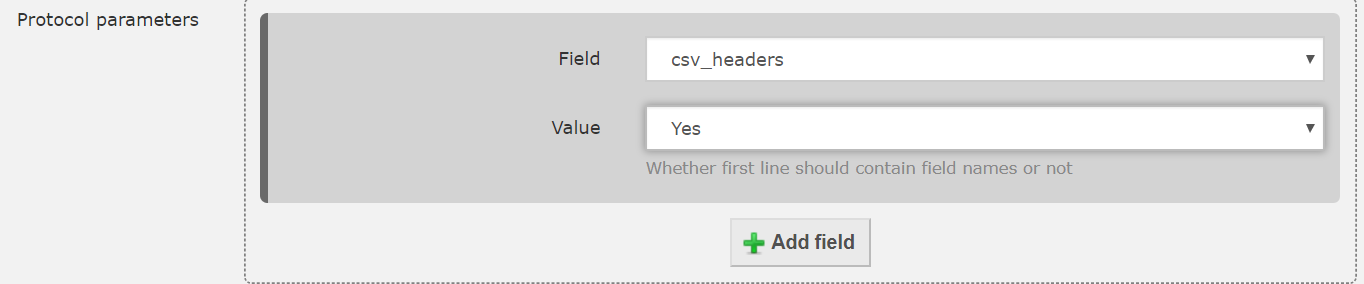 | csv_headers | CSV | Whether first line should contain field names or not. Accepted values: 1 (yes) or 0 (no) Default value: 1 |
