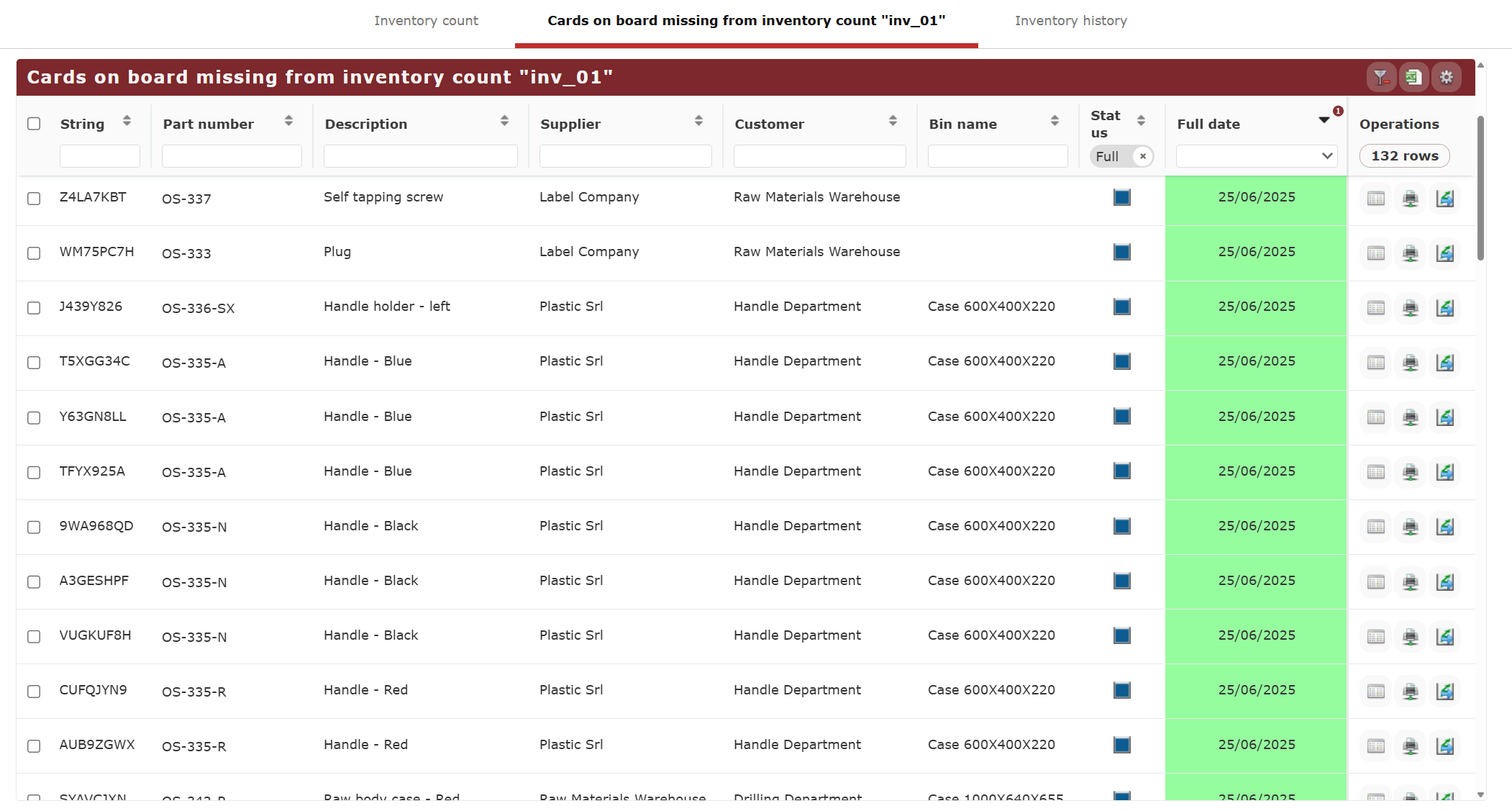 Releasing the cards in the Full status that were not found during inventory is necessary to properly realign KanbanBOX with the actual situation in the warehouse or the inventoried areas.