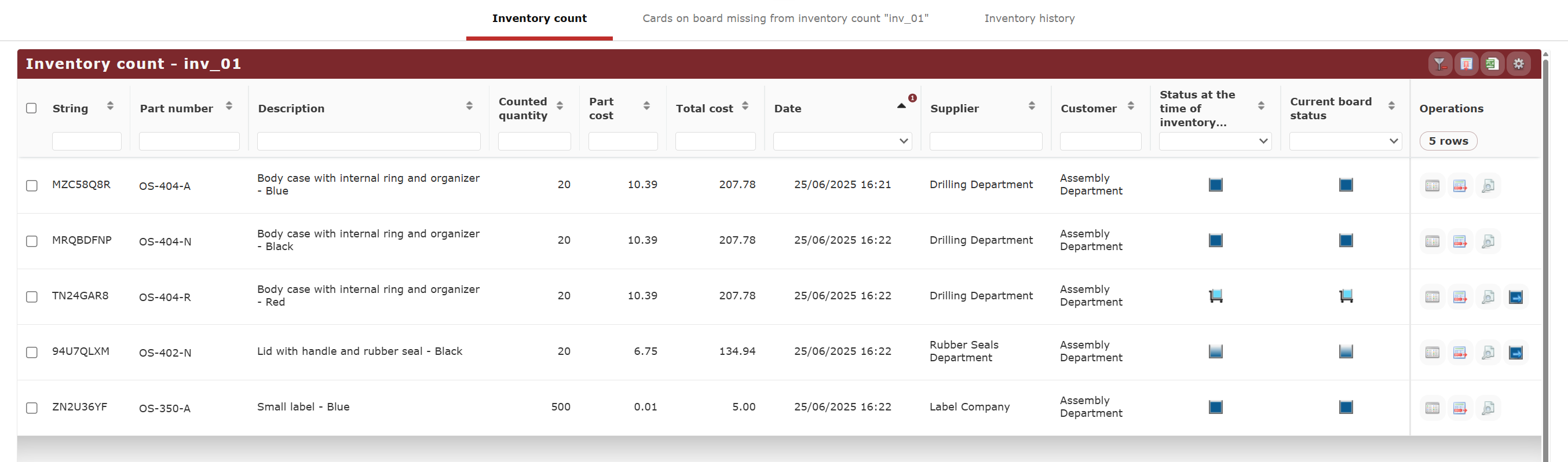 In KanbanBOX you can deal with periodic inventory counts (such as annual) or with continuous inventory counts.