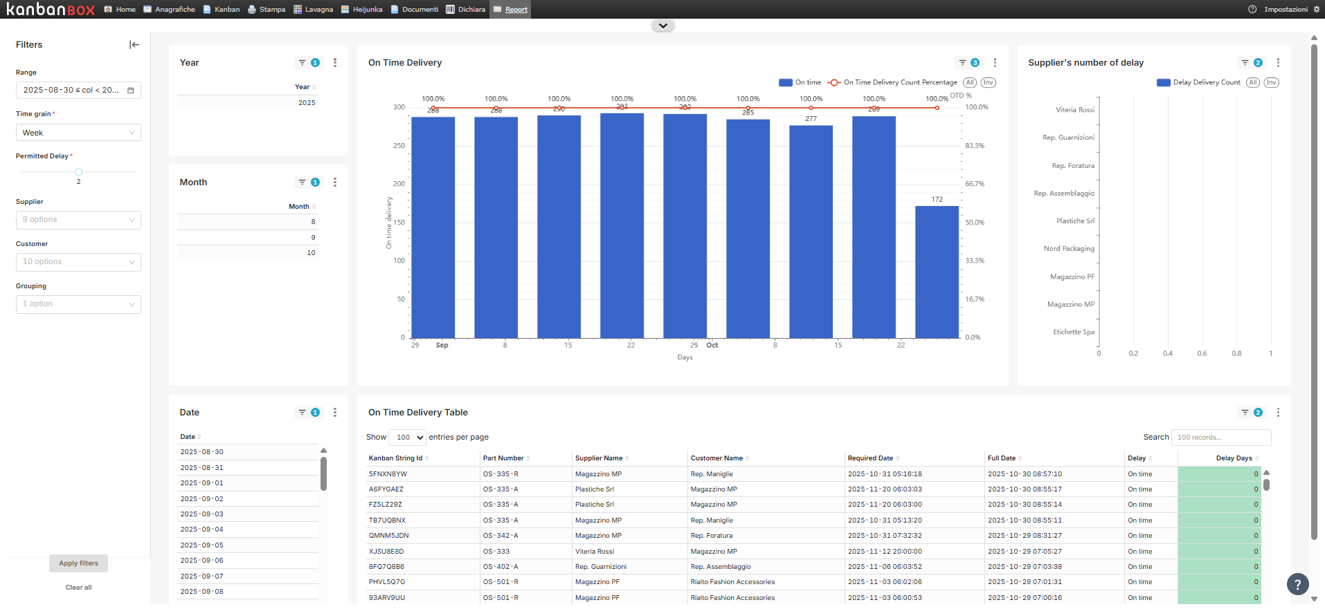 On Time Delivery: indica quante consegne sono state effettuate in orario ("on time") o con ritardo ("delay"), in un determinato periodo di tempo (selezionabile tramite il filtro). Ciascuna colonna del grafico contiene una parte blu (numero di consegne in orario) e una parte rossa (numero di consegne con ritardo).